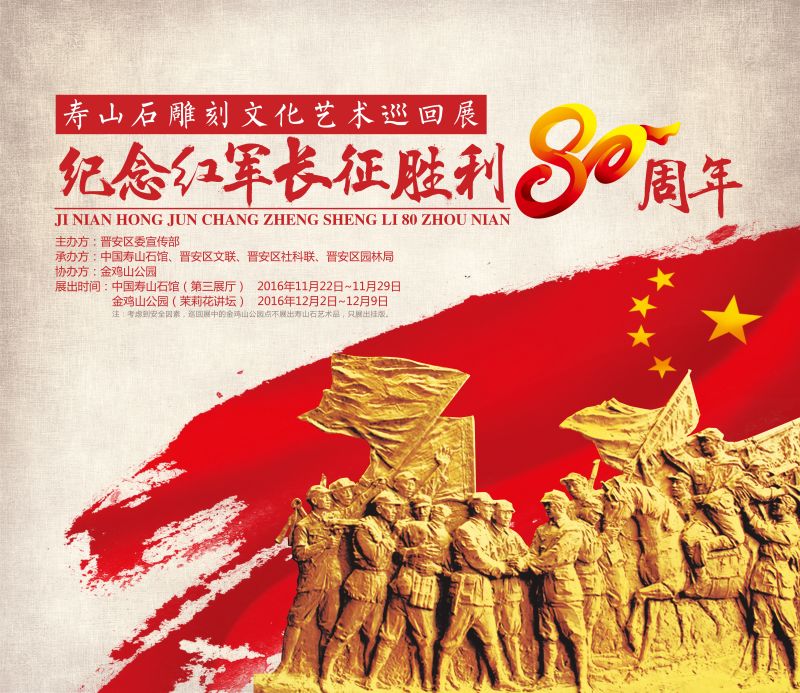 弘扬红军长征精神、继承和发扬优良革命传统、打造红色艺术精品,并以此展示晋安区特有的文化魅力,激励全区人民满怀激情,投入到百日攻坚、发展区域经济、繁荣地方文化的新长征中。由晋安区宣传部主办,中国寿山石馆、晋安区文联、晋安区社科联、晋安区园林局承办,金鸡山公园协办的《纪念红军长征胜利八十周年寿山石雕刻艺术巡回展览》,将于2016年11月22日至12月10日正式在中国寿山石馆和金鸡山公园举行。