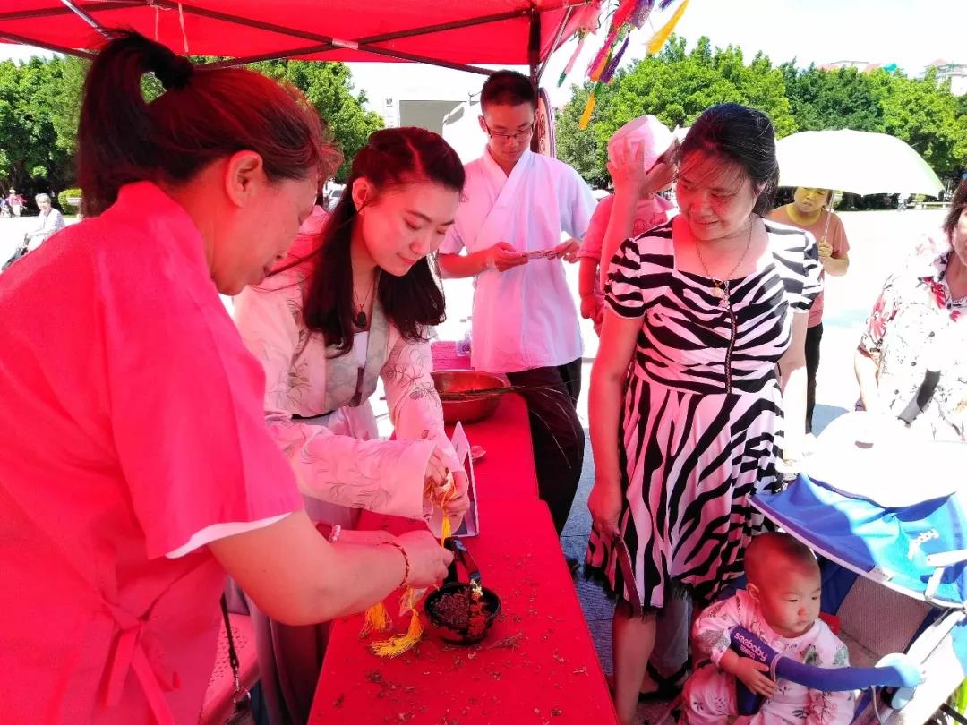 演出的同时,仓山区传统文化促进会带来的沐兰汤、点雄黄、佩香囊、包粽子等一系列端午习俗体验活动,让群众感受端午佳节承载的文化内涵,主办方还邀请福州瑞来春堂中医专家现场义诊并赠送香囊和菖蒲艾叶,固德口腔的牙科专家提供公益口腔检查,传播口腔健康理念。