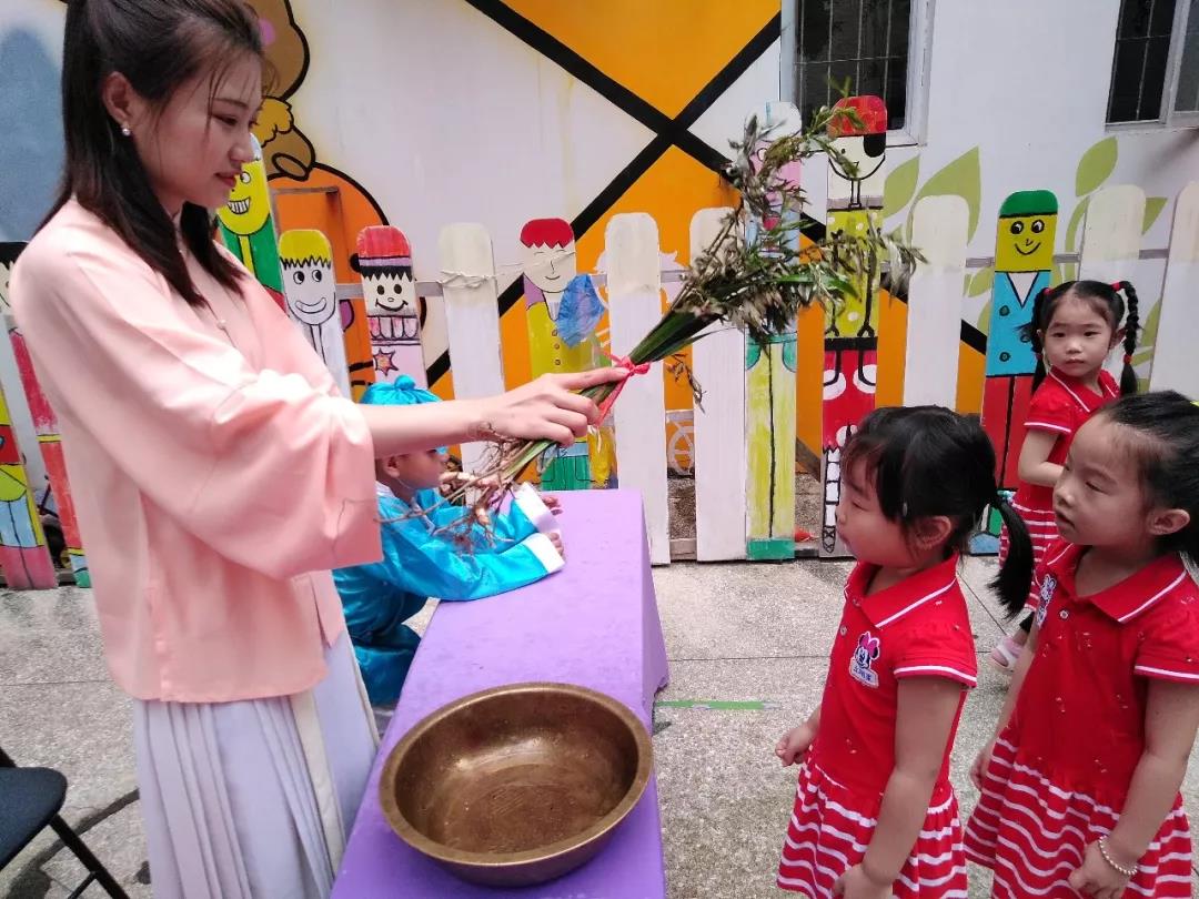 活动开始,文化馆的志愿者为孩子们讲述端午节的来历与意义。接着,仓山区传统文化促进会的志愿者身着汉服为孩子们沐兰汤,在双手、额头、脖颈轻轻拂拭艾叶水,以示驱除晦气,并用沾着雄黄酒的毛笔,在小朋友的额头上写上“王”字,还原古时候端午节给孩子点雄黄的习俗。另外,主办方还为孩子们准备了香囊佩戴在身上,香囊中所用的中草药物,能散发出天然的香气,具有化湿醒脾、驱蚊避虫等功效。金桔幼儿园还为小朋友们分发纸粽子,进一步了解端午节和粽子的关系,更深刻体会端午节的内涵。