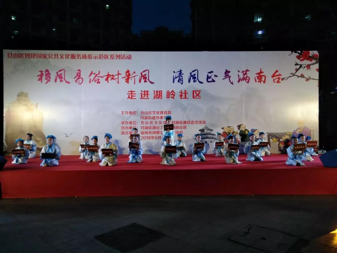 为培养和践行社会主义核心价值观,大力营造移风易俗、文明节俭的舆论导向和社会氛围,实行婚事新办、丧事简办、小事不办,有效弘扬社会正风正气,形成全社会崇尚文明、节俭、科学的良好风尚,6月12日晚上,由仓山区文化体育局、对湖街道办事处共同主办,仓山区文化馆、对湖街道综合文化站联合承办,对湖街道纪工委、湖岭社区协办的“移风易俗树新风,清风正气满南台”仓山区创建国家公共文化服务体系示范区活动在对湖街道湖岭社区文化广场举办。