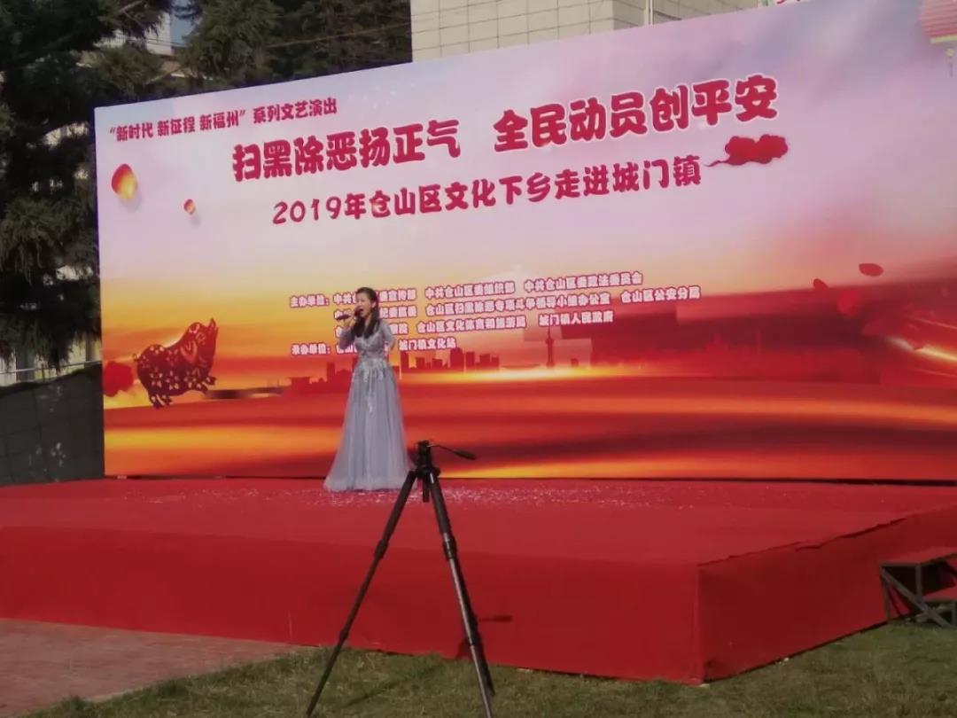 仓山区文化部门为城门镇现场带来了精彩的文艺汇演,演出活动在热闹喜庆的舞蹈《红红的日子火火的情》中拉开序幕,仓山区老体协舞蹈队的成员们为我们展现了我区老年人年轻向上的精神风貌,藏族歌曲《故乡宝吉》唱出祖国平安祥和的社会环境,赞美壮丽的大好河山,藏族舞蹈《弦舞金山》动作优美连贯,让我们更深入了解了藏族文化,精彩的魔术表演带我们进入了一个神奇的魔幻世界,滑稽的语言、诙谐的表演,令现场气氛十分热烈,女声独唱《海之梦》、《青春舞曲》旋律优美,女歌手婉转悦耳的歌声给我们带来了一场精彩的听觉盛宴,福州方言歌曲《福州歌齐来唱》、《虾米弟》贴近生活,拉近了与群众间的距离,最后活动在欢快的舞蹈《相约动起来》中落下帷幕。在文艺节目间隙穿插进行“扫黑除恶”有奖知识问答,吸引不少观众抢答,将现场气氛推向一个又一个高潮。